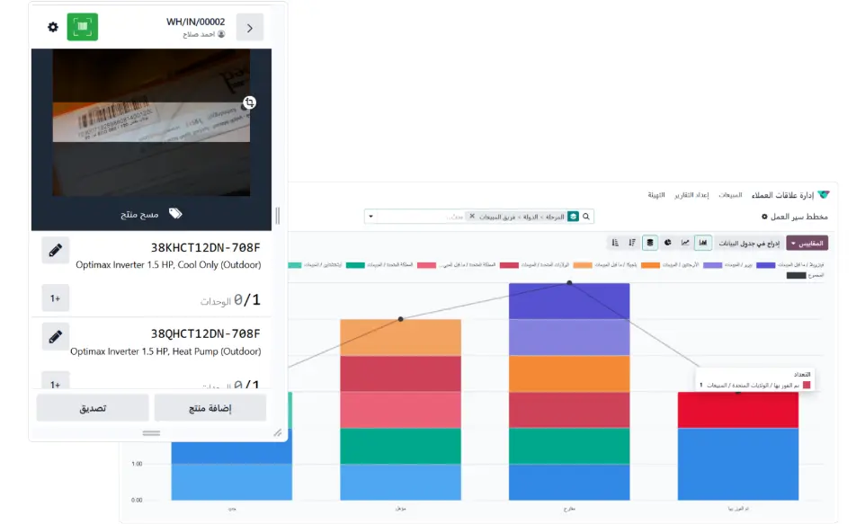 يساعد هذا على منع الأخطاء الناتجة عن استلام أو صرف موديل بديل بالخطأ، ويضمن أن كل قطعة مسجّلة برقمها التسلسلي الصحيح في قاعدة البيانات. إلى جانب ذلك، يمكن إرسال عروض الأسعار ومواعيد التركيب عبر واتساب أو البريد الإلكتروني، وتُسجَّل الردود داخل النظام كسجل رسمي للعميل.