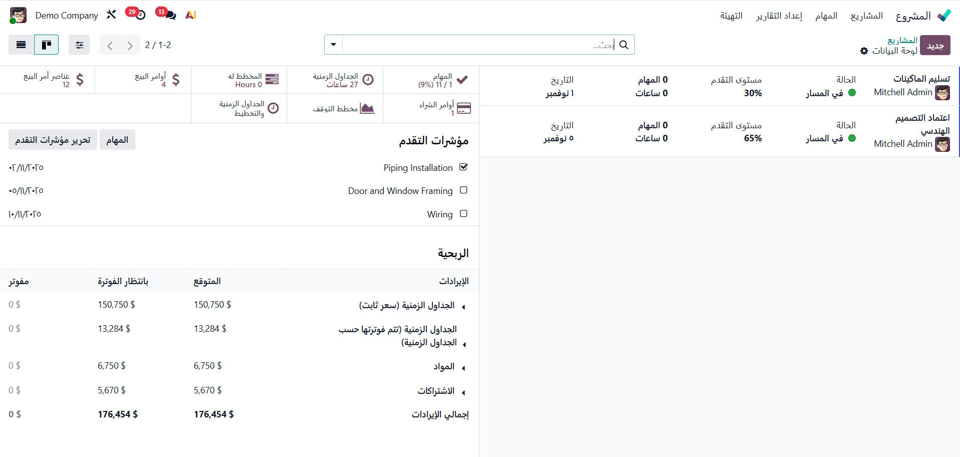 تتبع التكلفة الإجمالية للمشروع في الوقت الفعلي، بما يشمل تكلفة المواد، العمالة، والمصروفات الفنية, وتوزيع تكلفة المهندسين والفنيين على المشروعات بدقة عبر الـTimesheet المرتبطة بالمهام اليومية. و عرض مخطط جانت (Gantt Chart) لتخطيط مواعيد التنفيذ ومتابعة التقدّم الزمني للمشروعات.